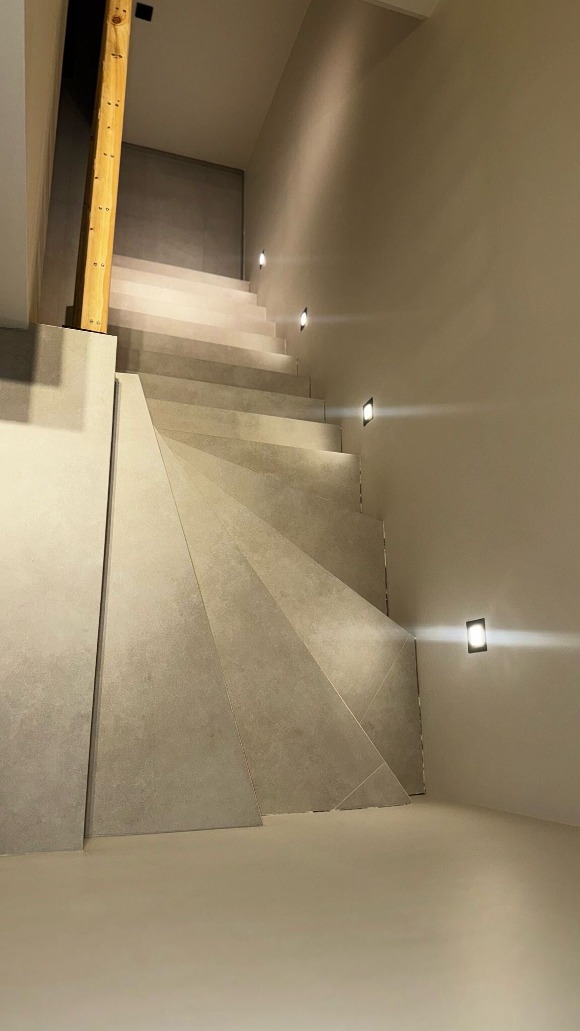 Des marches en carrelage effet pierre, associées à un éclairage intégré et des finitions bois, pour un style moderne et intemporel.