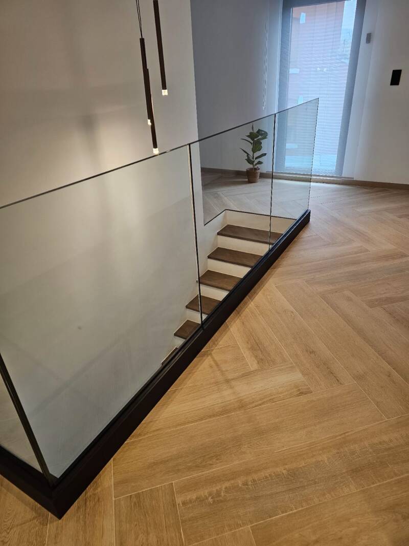 Carrelage effet bois grand format, pose en chevron et garde-corps vitré : une combinaison élégante qui mêle modernité et confort visuel.